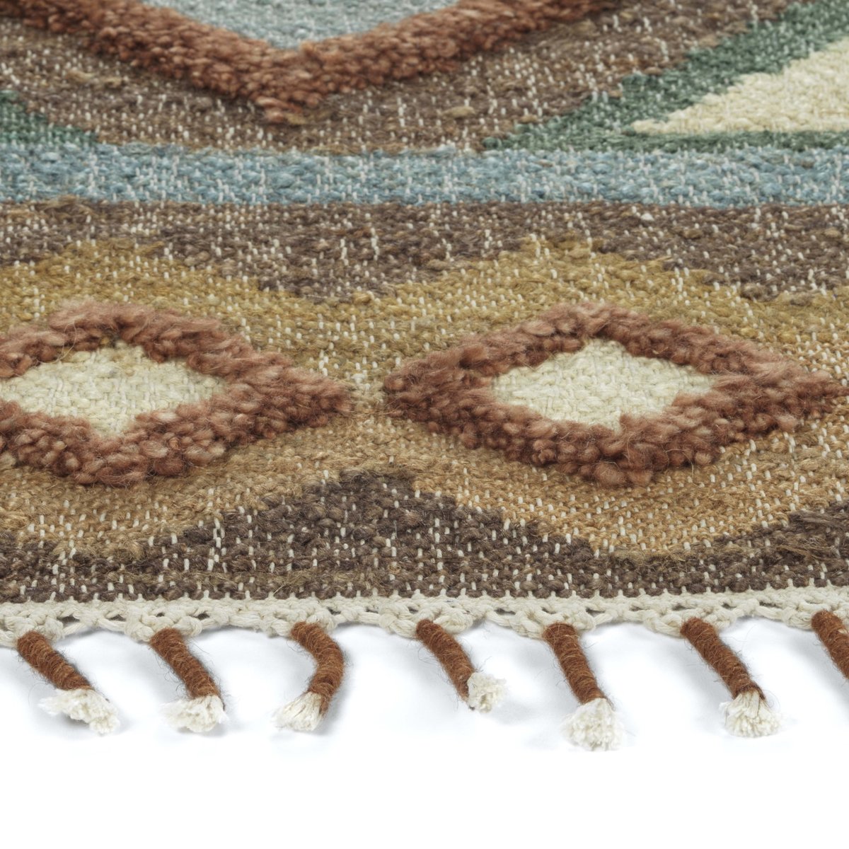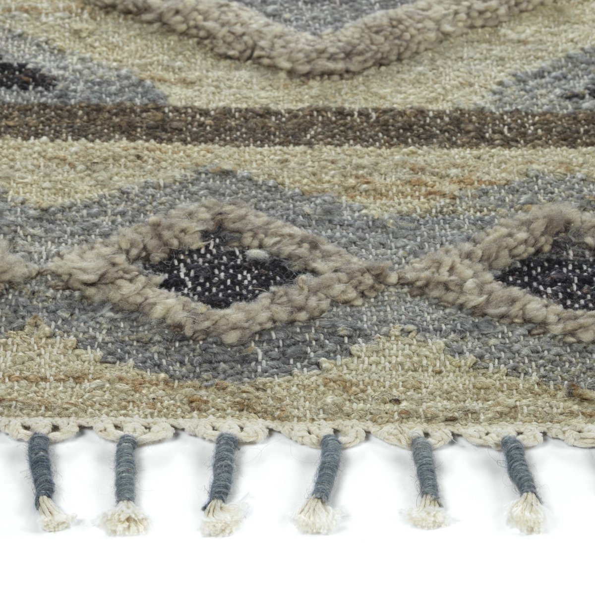 • This jute and wool rug features a high pile of masterfully hand-woven fibers and elephant-style tassels for extra texture.
