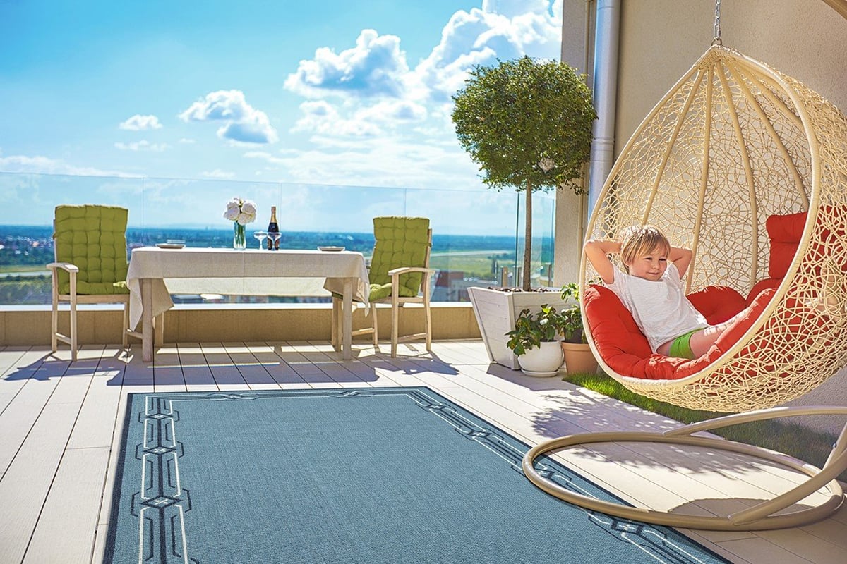 • A gorgeous border and simple design lend incredible versatility to this floor covering, so you can feature it in dining or entertaining spaces, inside or out.
