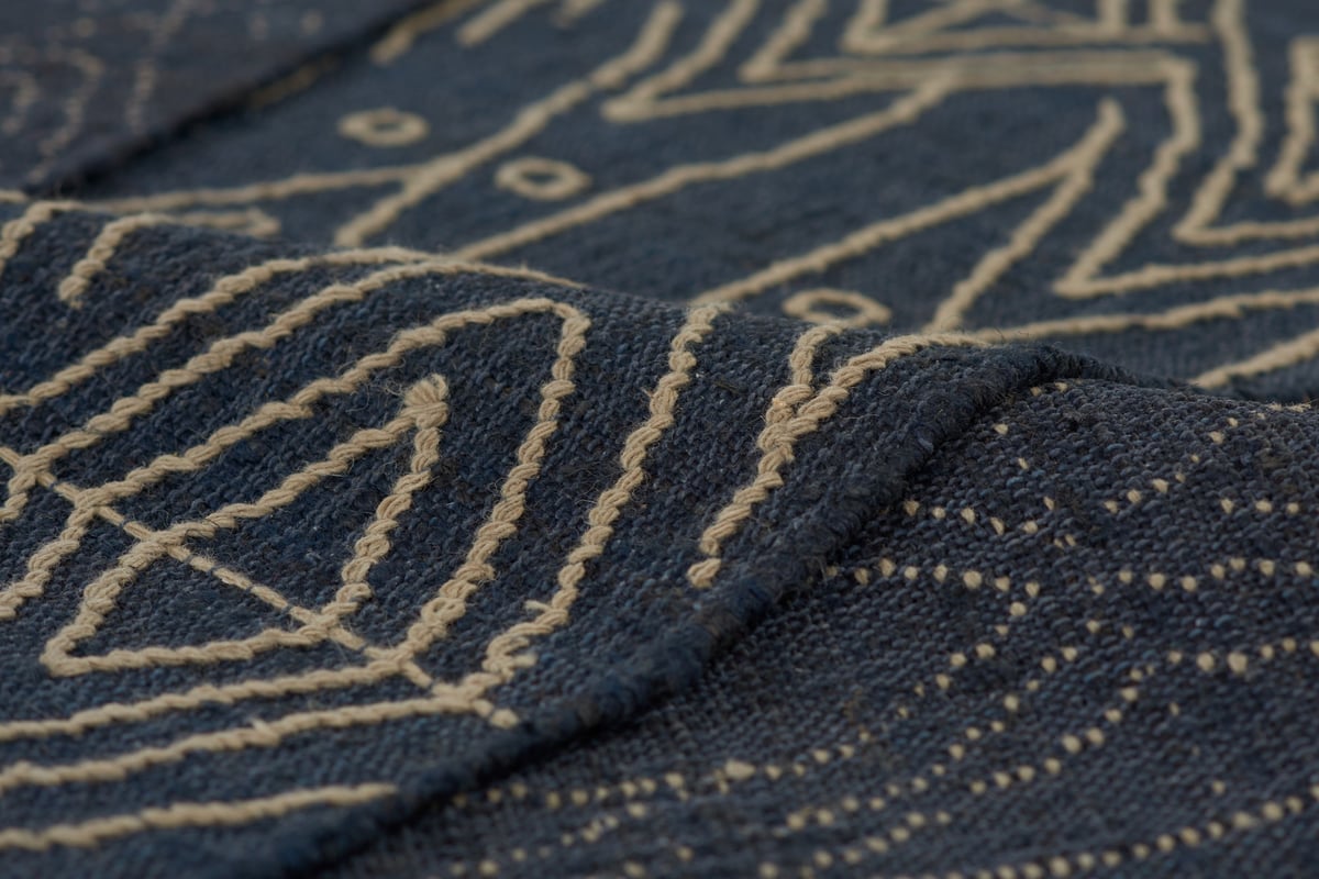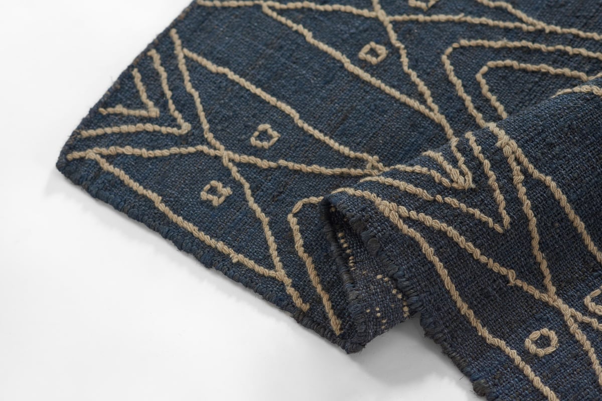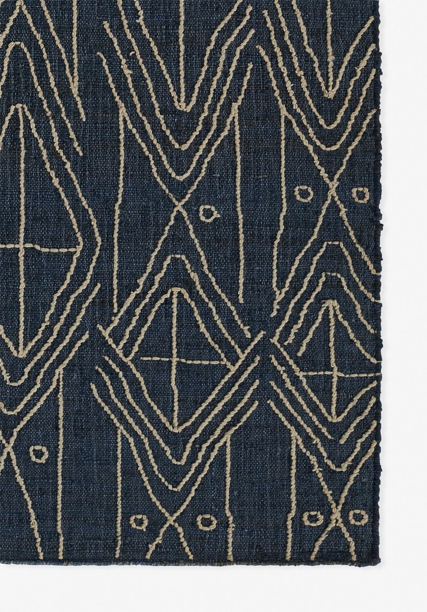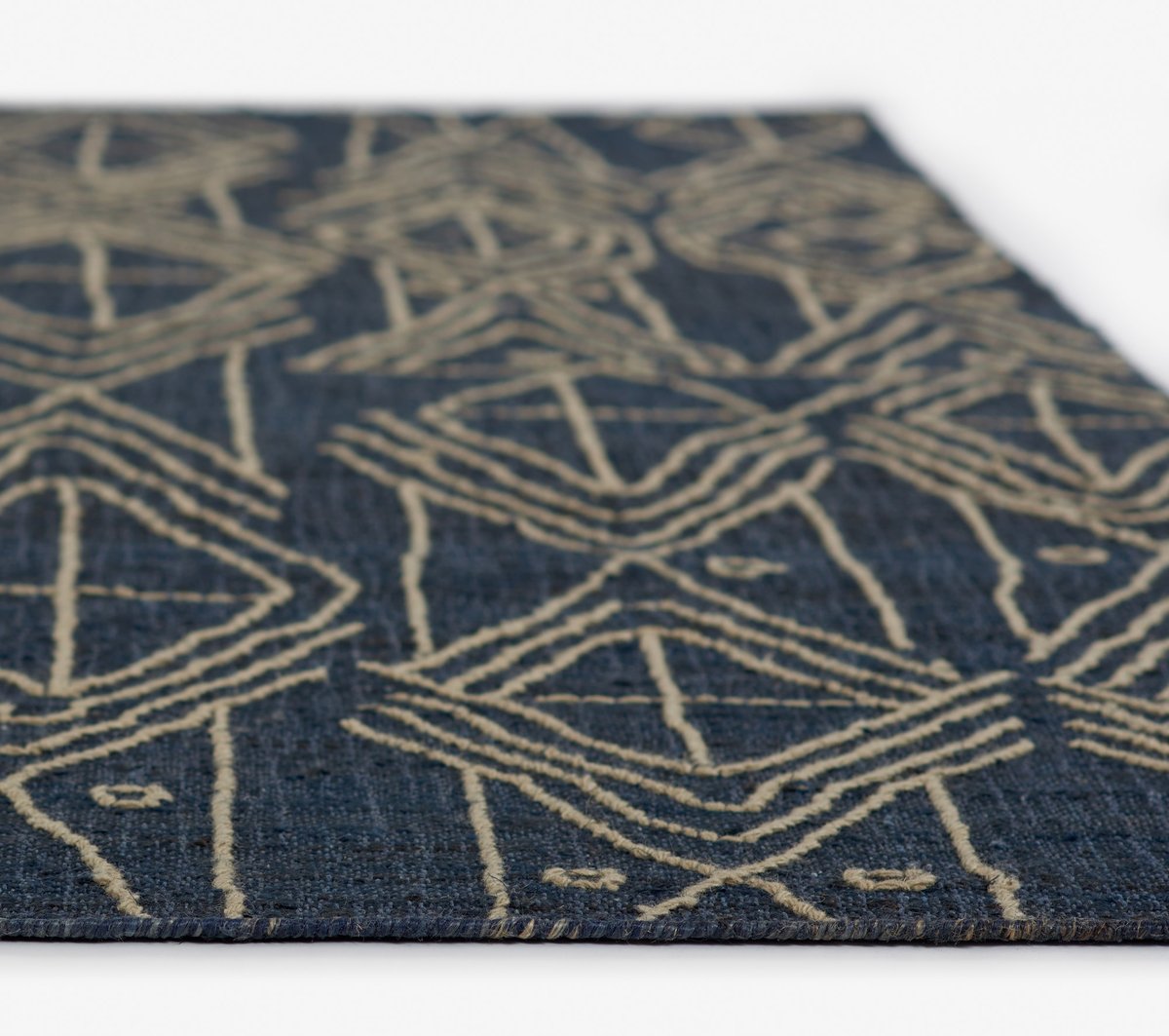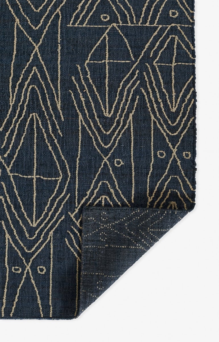 Inspired by the intricate geometric patterns used throughout African mud cloth textiles, the Argan collection by Lemieux Et Cie captures the eye with rhythmic repetition and thoughtful asymmetries. The handsome ARG-7 area rug is an especially colorful addition to the collection with expressive patterns rendered in light beiges over a striking blue base.