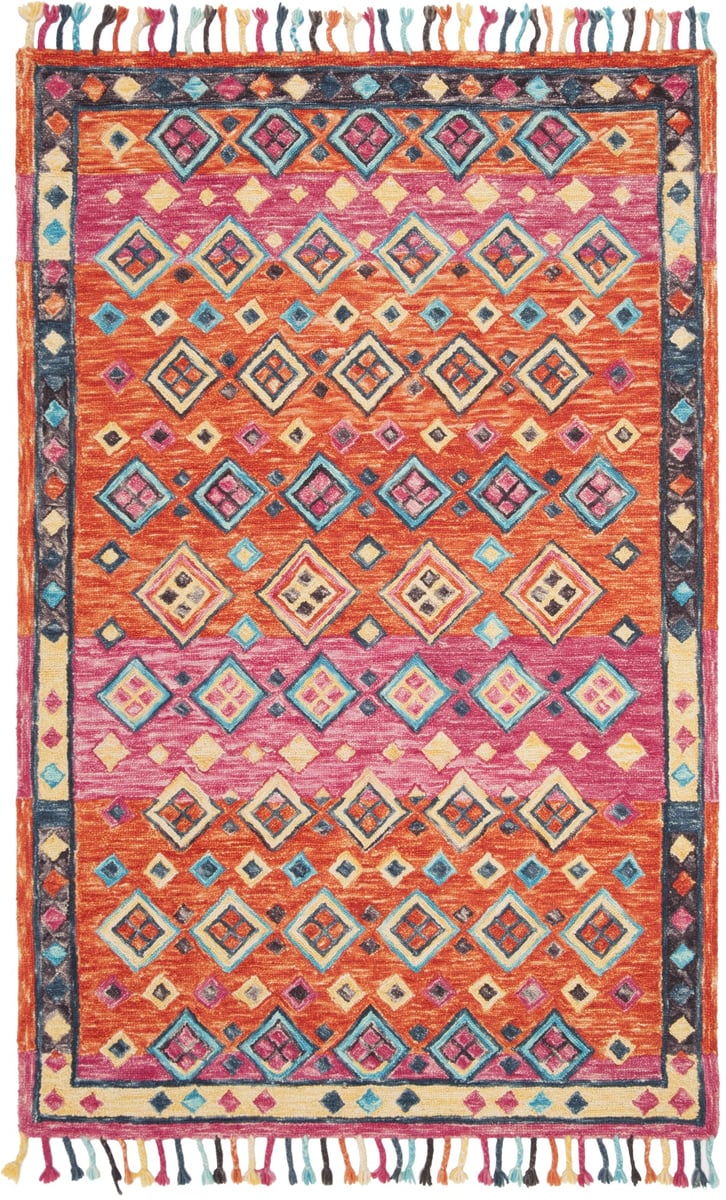 • Brilliant orange and fuchsia tones set this Southwestern piece apart, giving it a bohemian attitude that adds whimsy to your playroom, entryway, or kids' rooms.