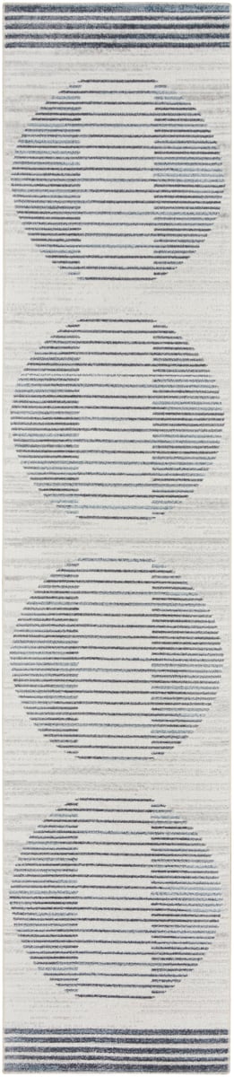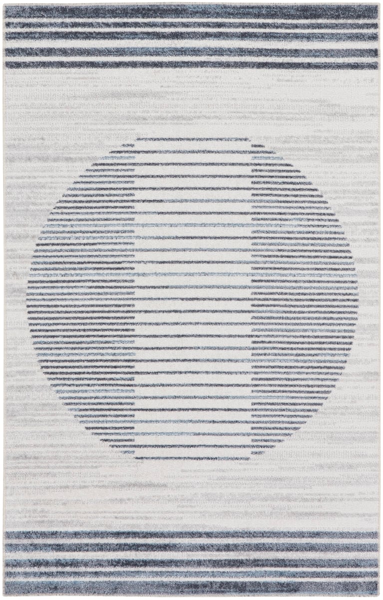 • With its circular and linear patterns and its ivory and blue color scheme, this modern area rug promises undeniable charm and a splash of Scandinavian flair.