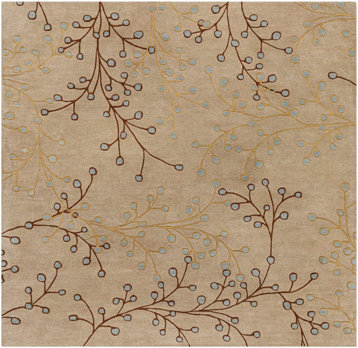 - This botanical area rug showcases a harmonious palette of shades including taupe dark brown and camel evoking the earthy tones of a tranquil forest setting. The design features a simple yet striking motif of berries delicately adorning branche for a visually appealing and eye-catching focal point.