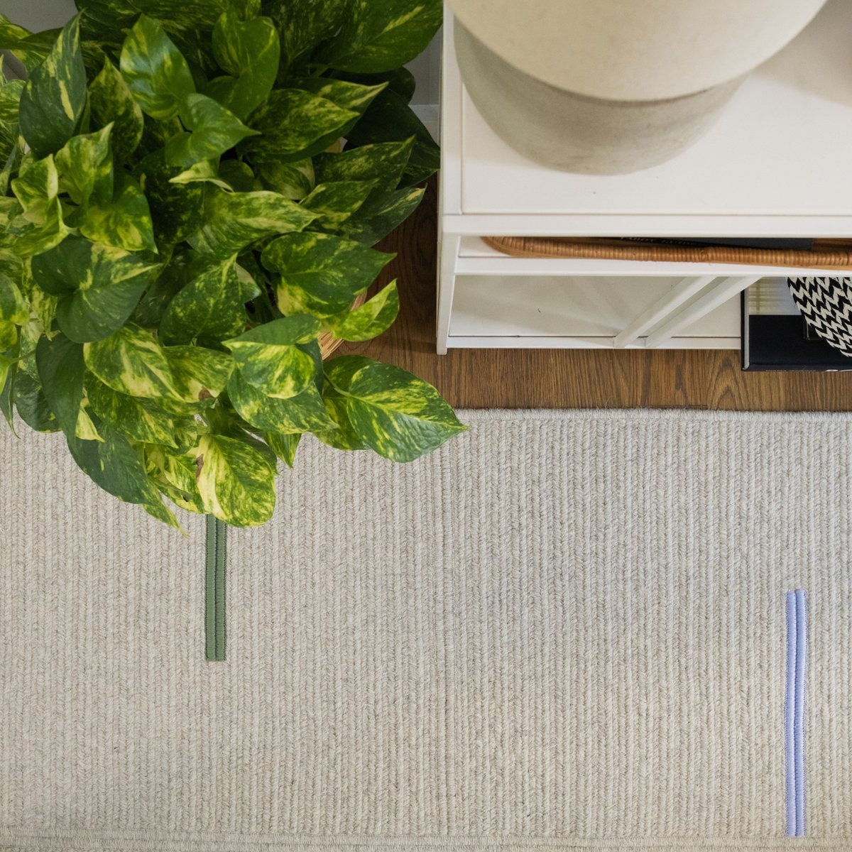• This 100% wool area rug combines undyed wool yarns with creative serged details. The base features a ridged texture created using an 8-carrier weave while the colorful dashes pop as raised rows.