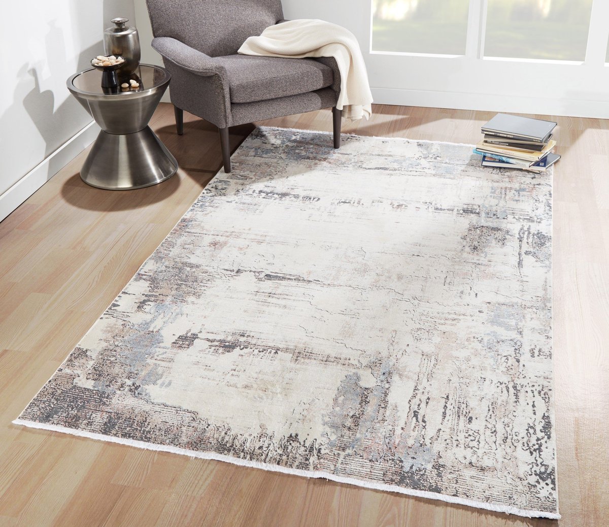 The contemporary movement of this modern area rug explores implied textures through sumptuous synthetic fibers. Dove gray, brown and white tones evoke urban sensibilities with an abstract design that evokes the look of peeling plaster. A combination of silky viscose and polyester threads create a subtle shimmering effect that makes this decorative rug a coveted floorcovering for every room.