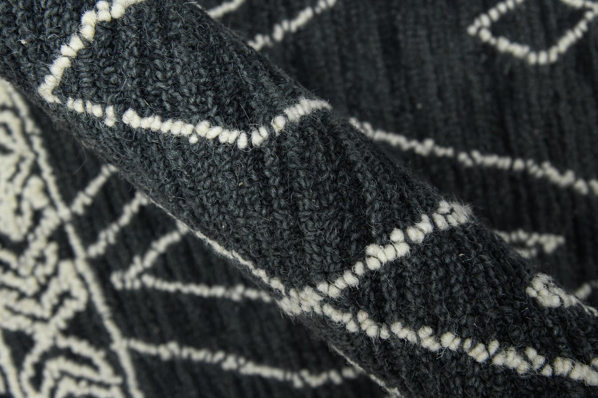 • Suney features a rich charcoal colorway, accented with geometric patterns in light ivory. Every line is rendered in plush looped pile for a creative three-dimensional texture.