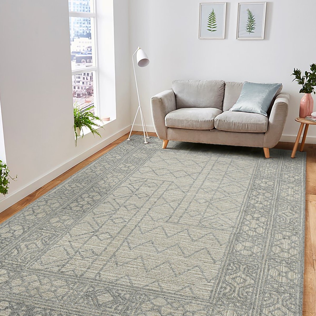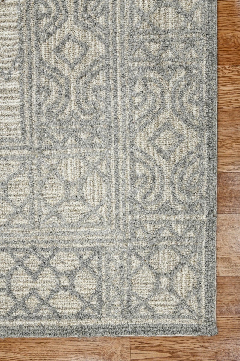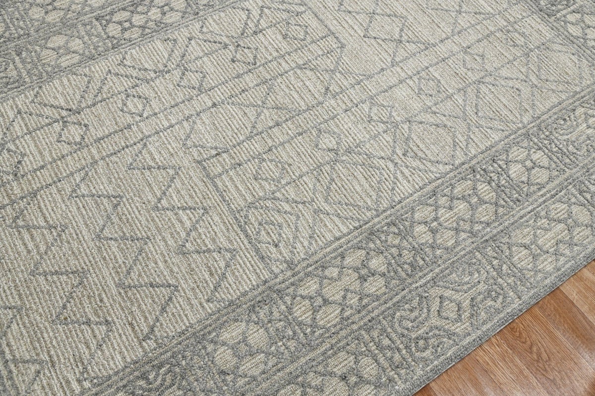 • Light geometric patterns fill the open field and layered borders, rendered in a textural looped pile that makes every detail seem to pop from the surface.
