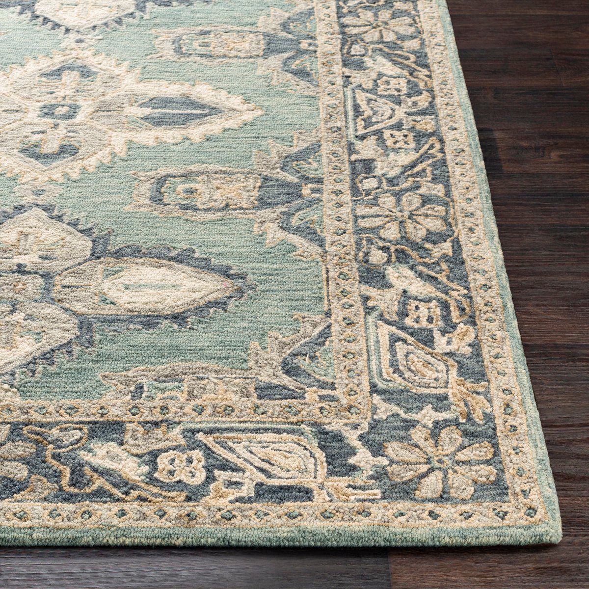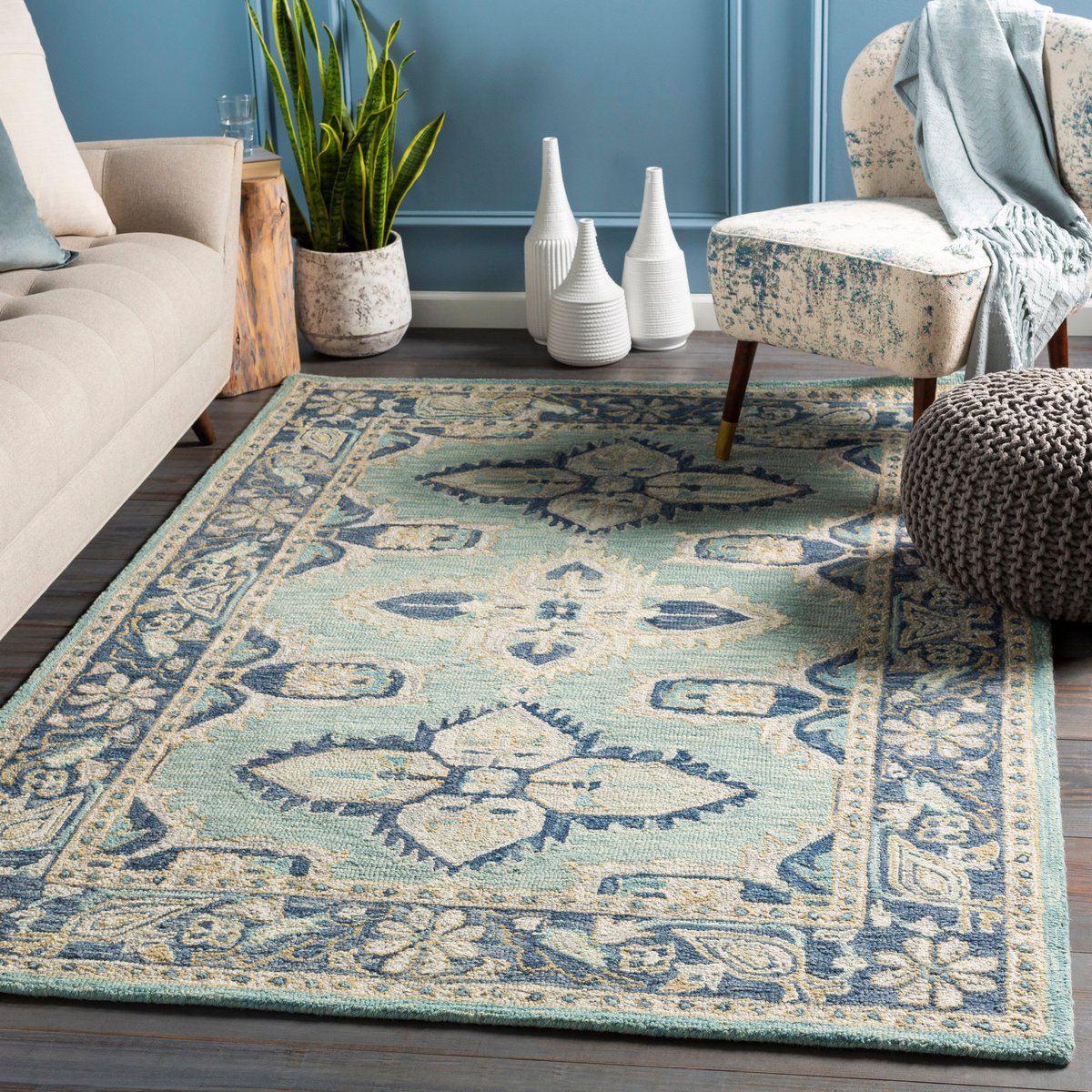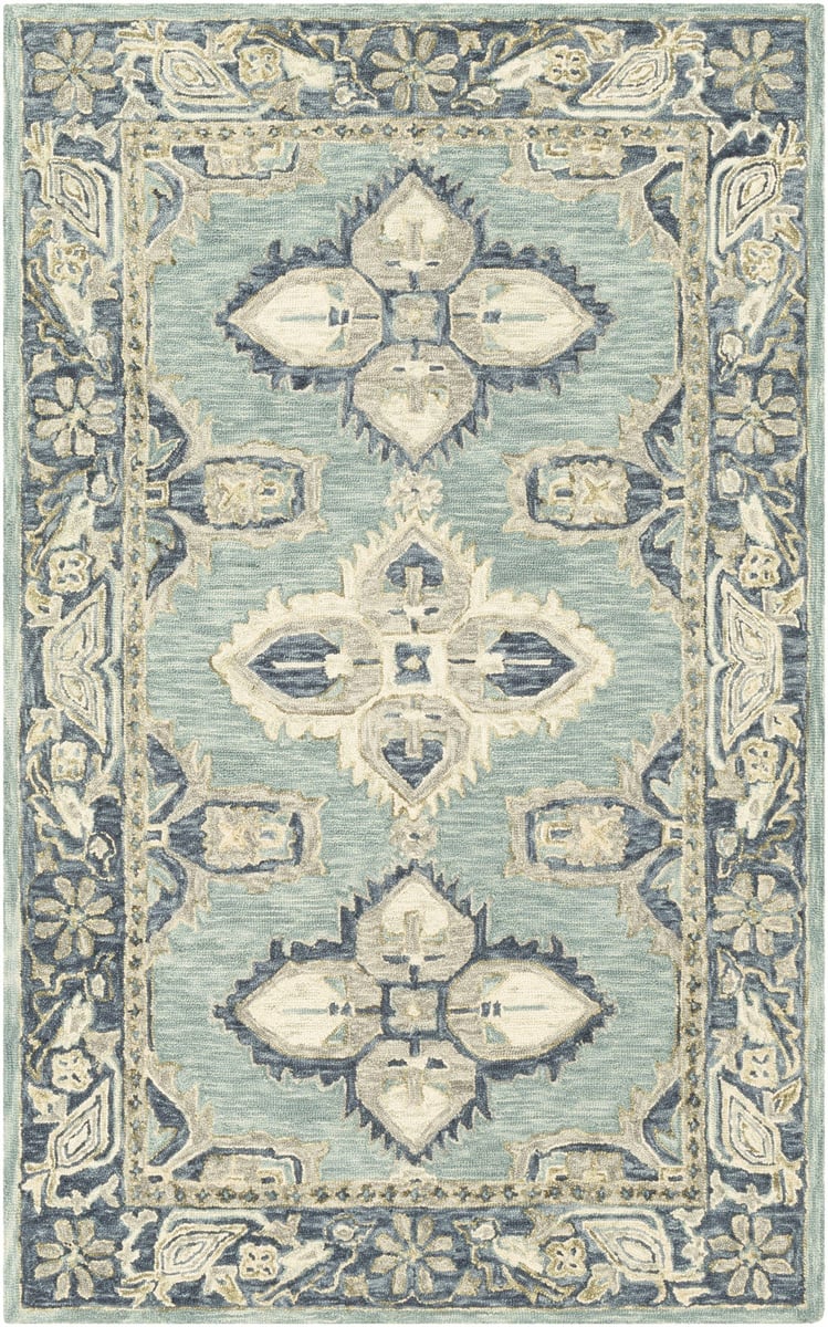 • With its stunning aqua, denim, beige, cream, and olive color scheme and its floral and medallion-style designs, this Bohemian area rug is fun, energetic, and captivating.