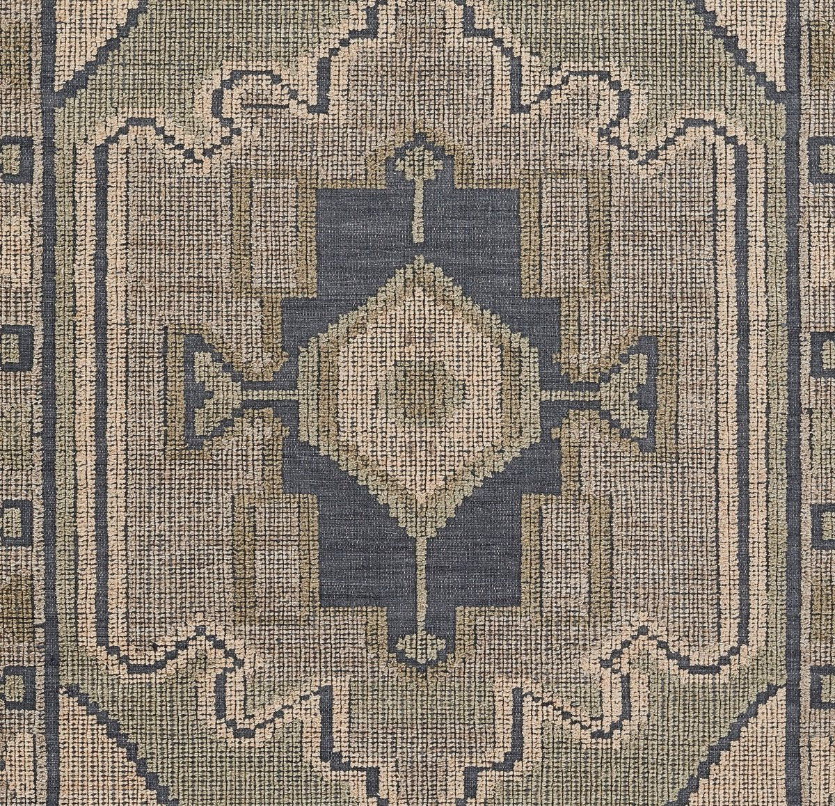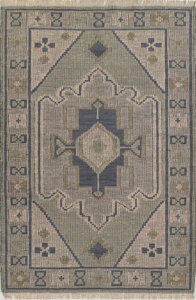 • While the traditional rug pattern is streamlined to its most basic elements, the texture goes bold for irresistible appeal. This rug is built around a flatwoven base while the patterns pop with soft pile construction.