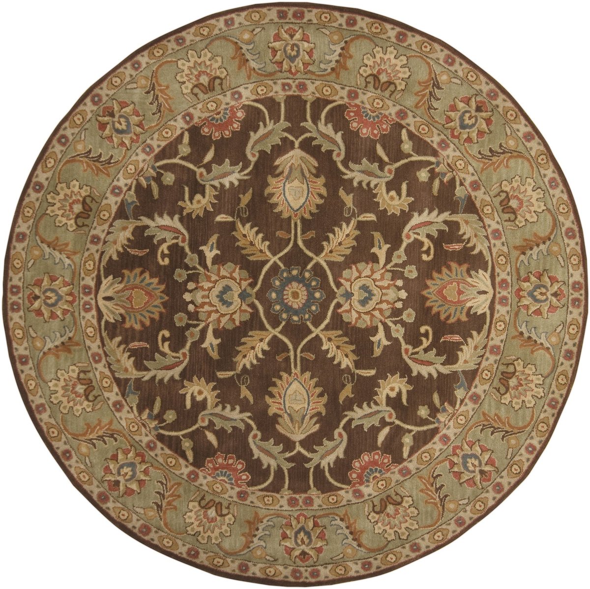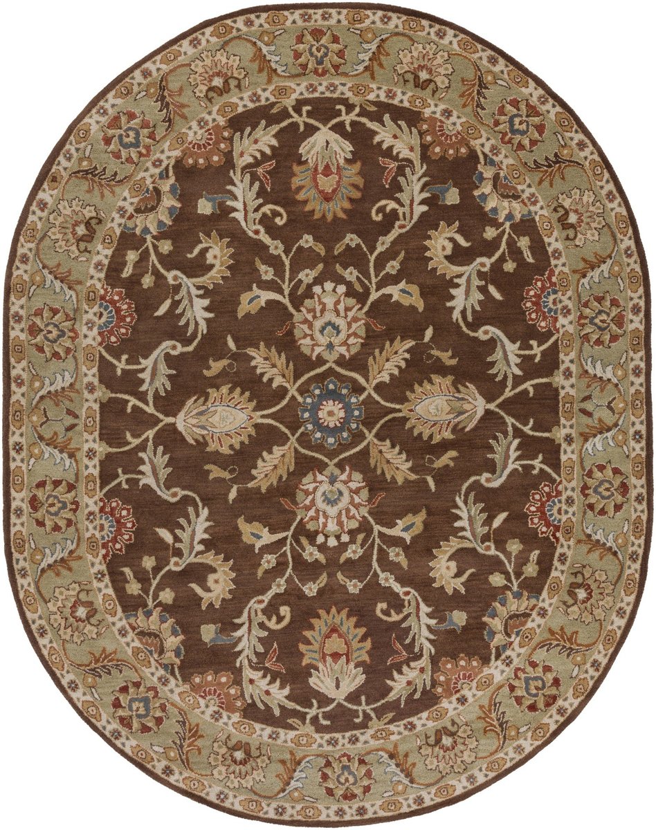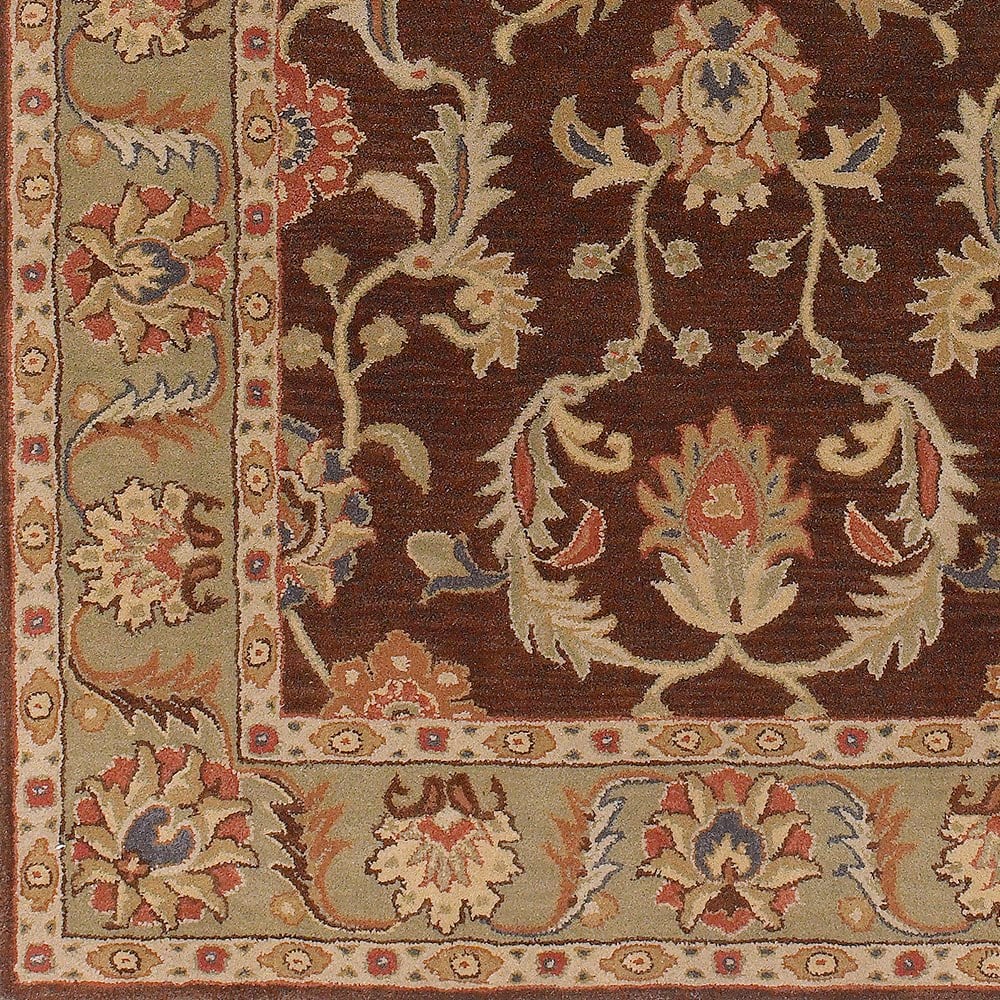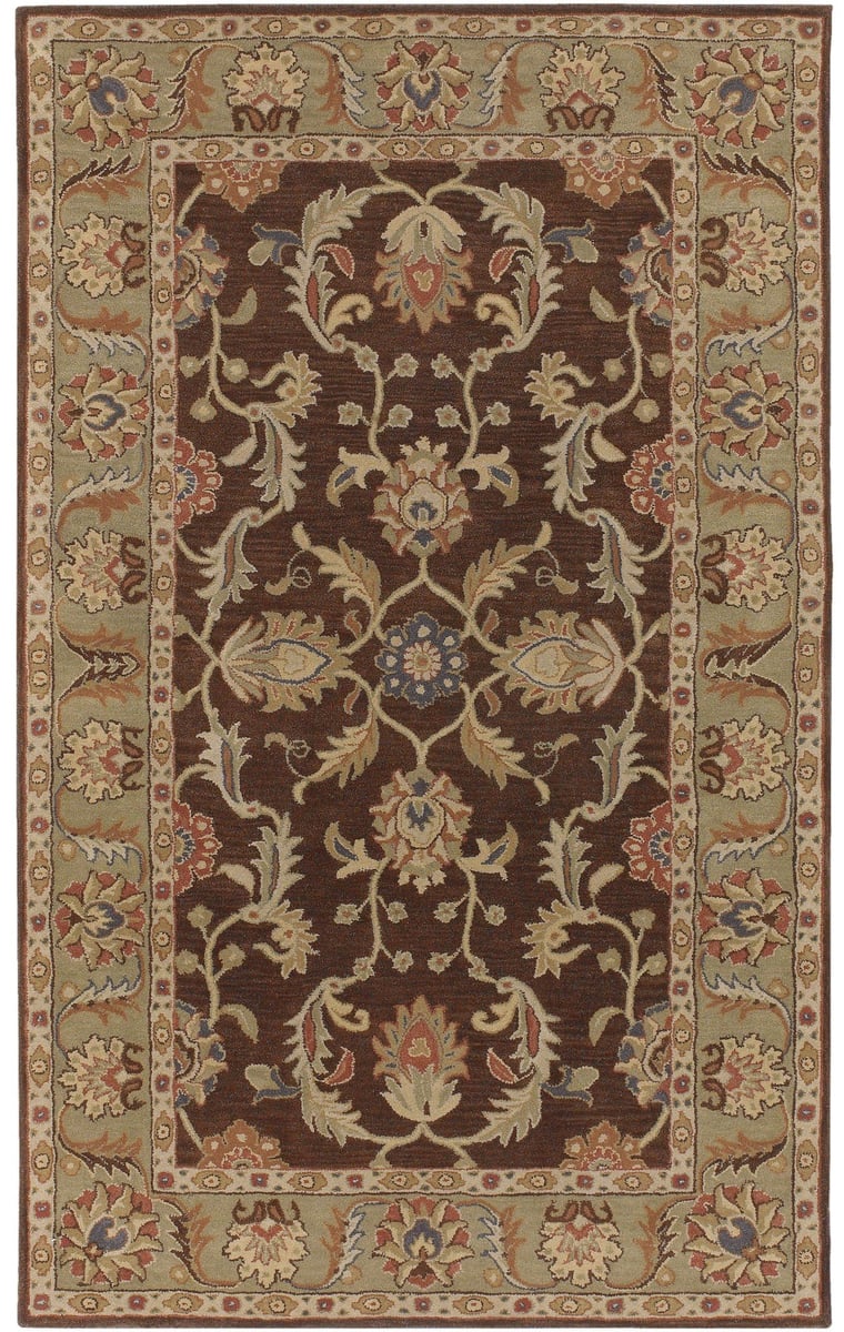 - With its rich dark brown, camel, and burnt orange color scheme, flourishing designs, and contrasting border, this traditional area rug makes a stunning, classic statement in your carefully-curated space.