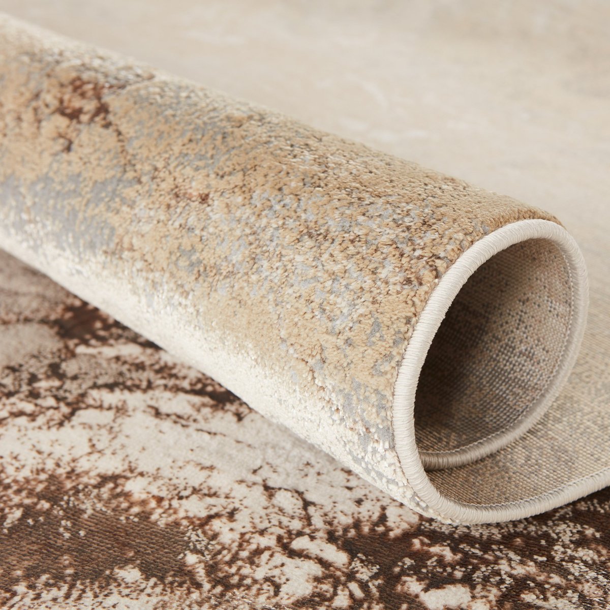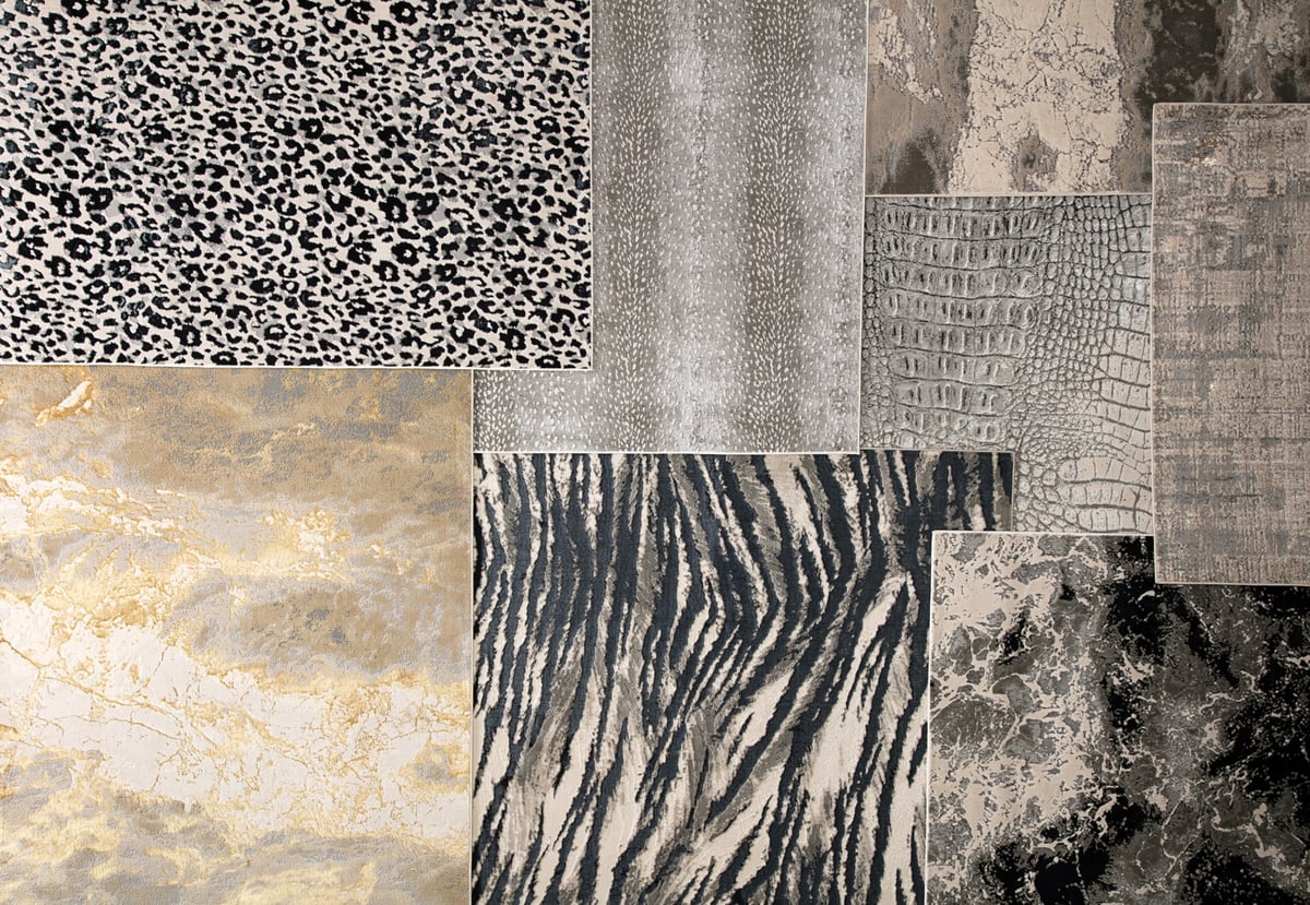 • Edgy and statement-making, this shimmering rug features a texturally intriguing abstract design in a neutral color scheme.