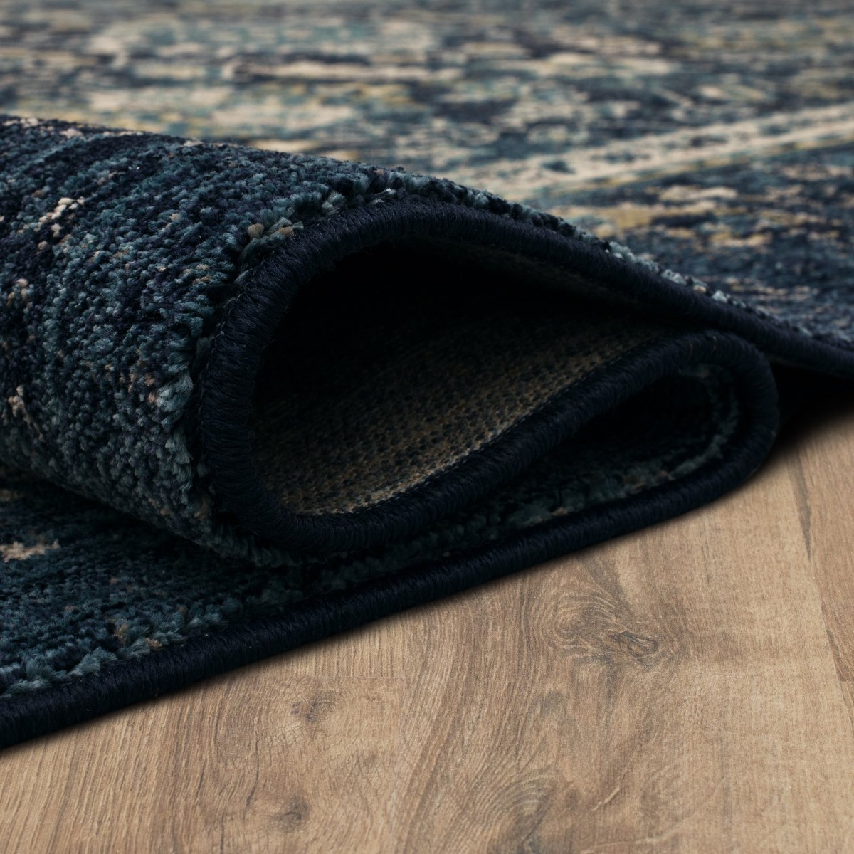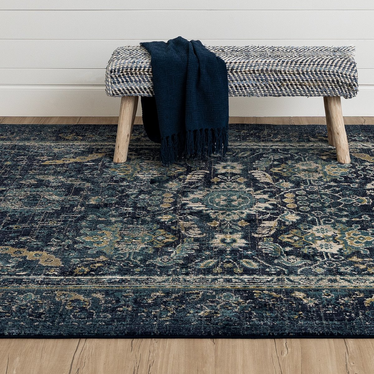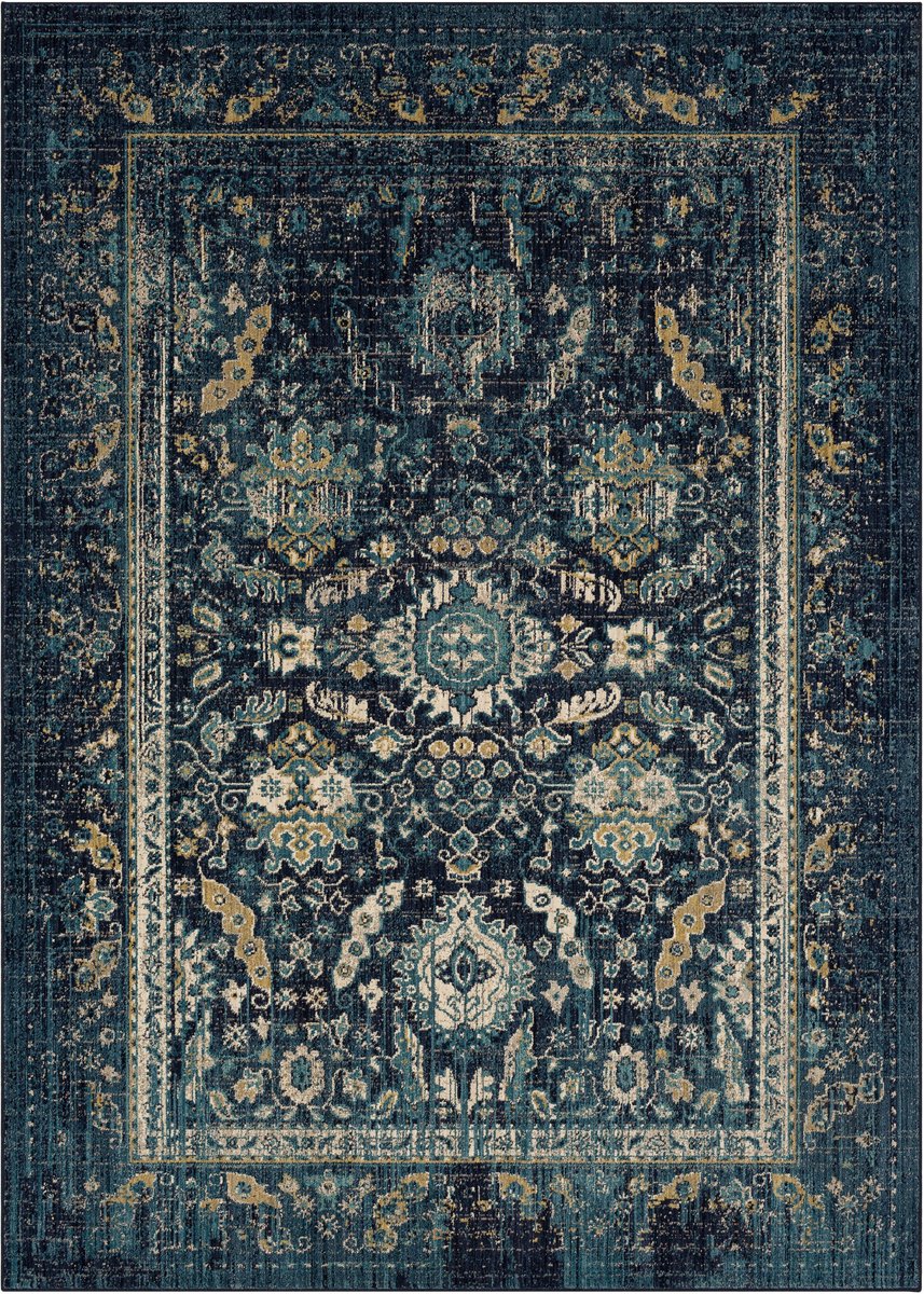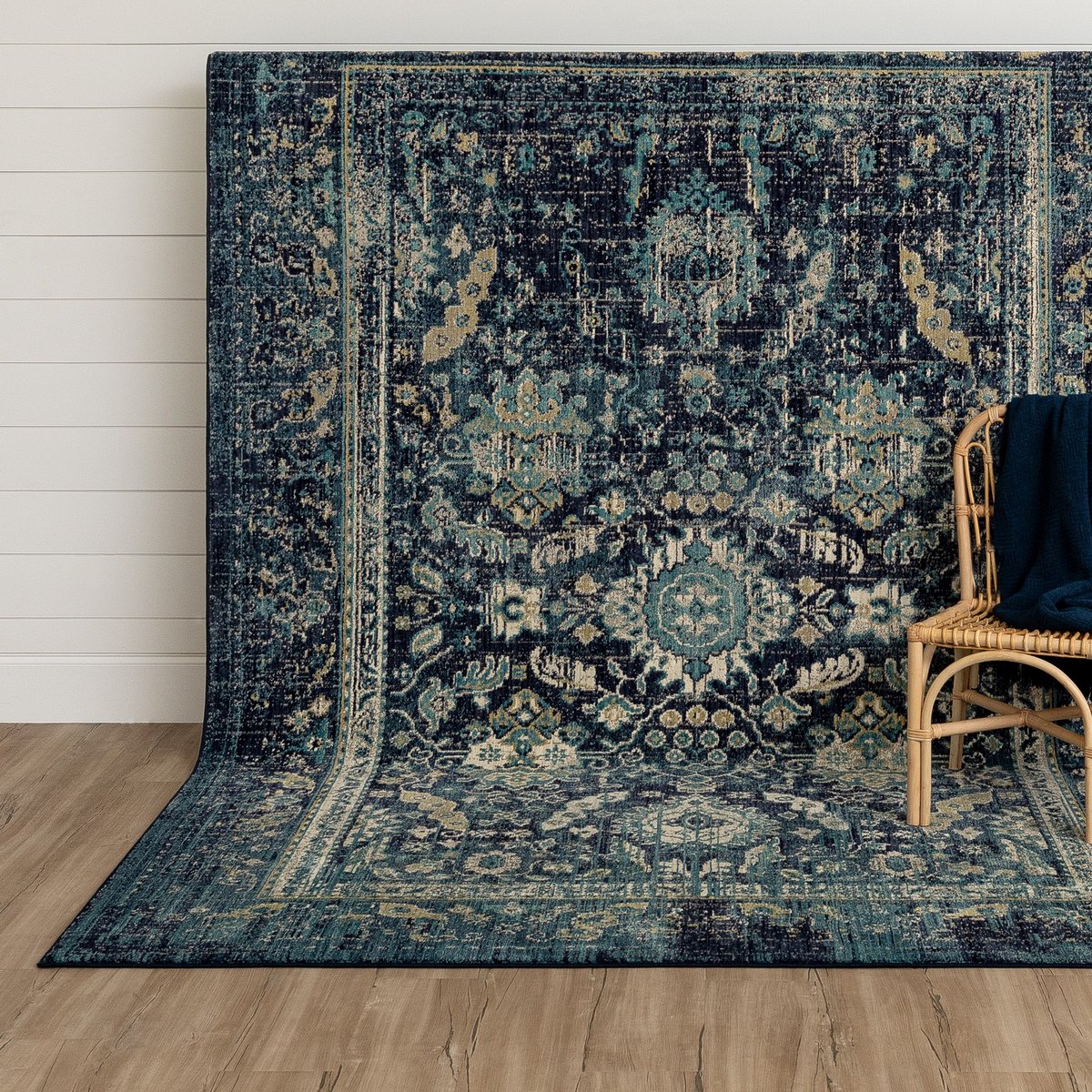 • The stunning, traditional area rug features arabesque and floral designs with an overdyed and distressed design. The timeless patterns take inspiration from oriental elements, and the gorgeous blue, green, and neutral color scheme promises depth and drama.