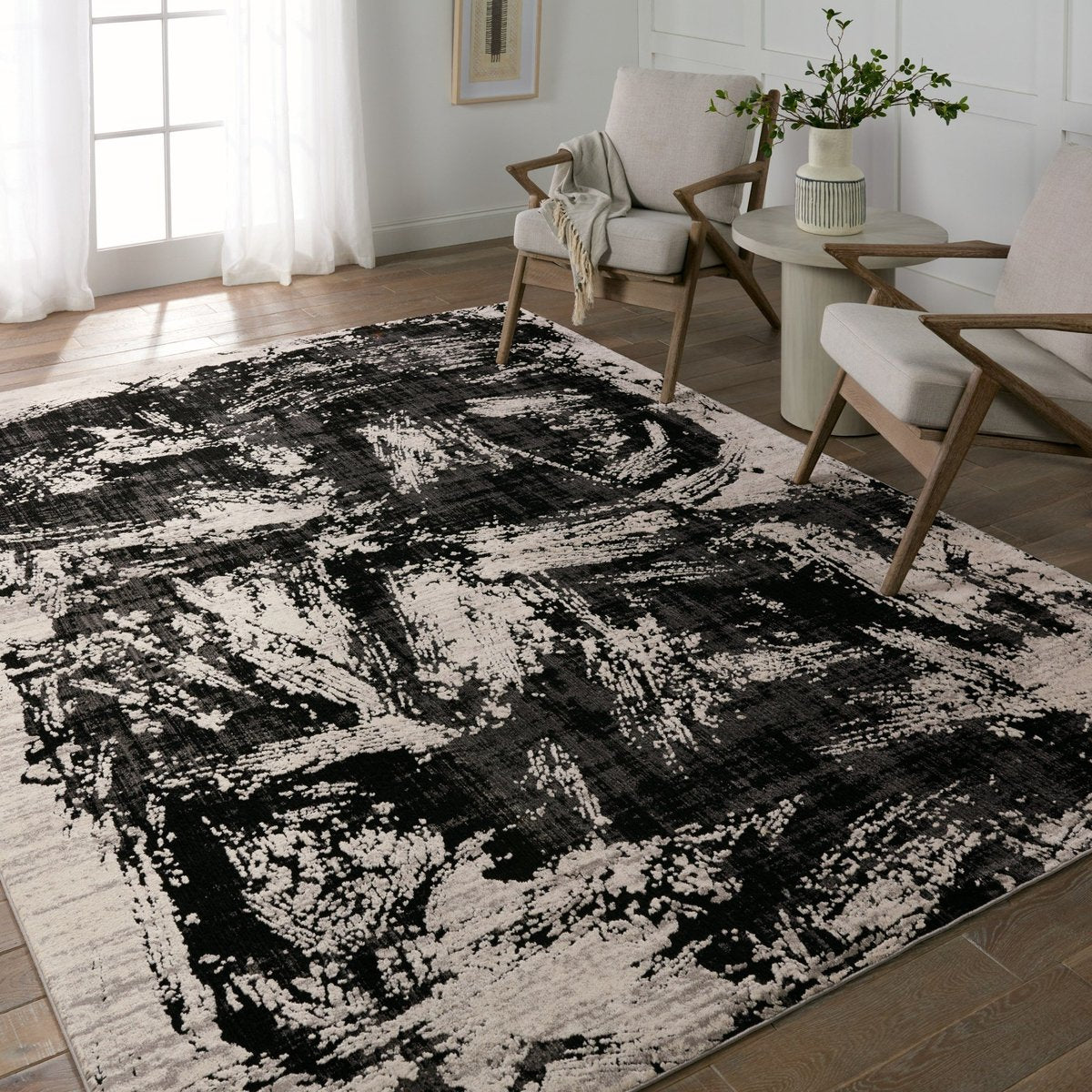 A modern statement for on-trend homes, the Graphite collection brings bold interest and dimension to contemporary interiors. The densely woven polyester and polypropylene blend lends a durable accent to heavily trafficked spaces. The Dusk design features an abstract design in moody hues of black, cream, and gray. The high-low pile provides texture and sheen to bedrooms, living rooms, offices, and entryways.