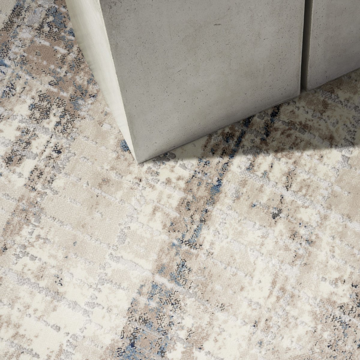 • In calming ivory, blue, and gray hues, this modern area rug is versatile, yet captivating. An artistic, abstract pattern gives the rug all the charm and flair your space has been missing.