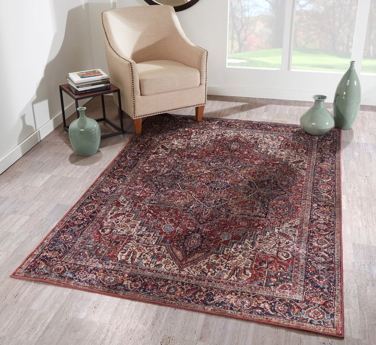 • Evoking Persian designs of yesteryear, this burgundy beauty creates a stylish foundation piece for your living room, dining room, or bedroom.