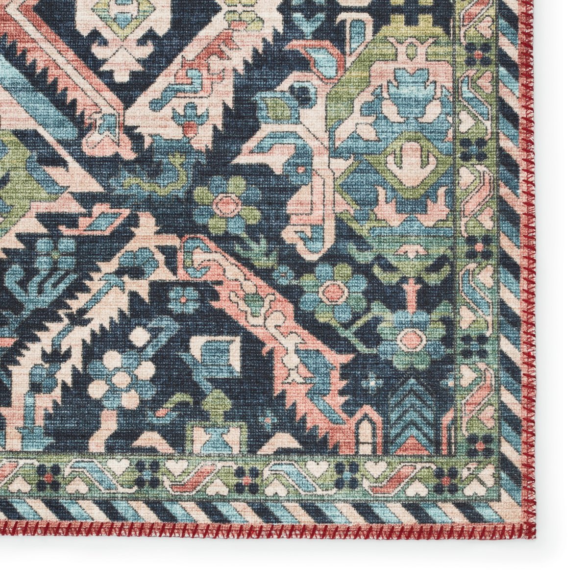 • The Teleza area rug boasts a saturated tribal motif with a detailed border and a moody deep blue, green, and clay colorway.