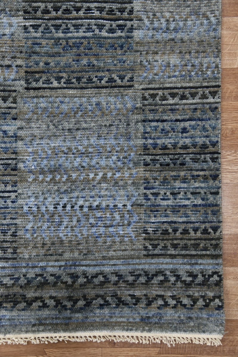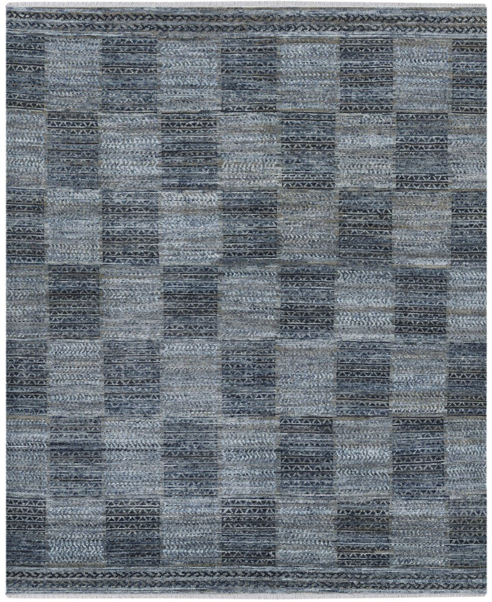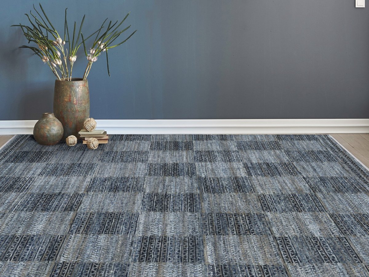• Barton features a checked design that alternates between southwestern rug patterns, all rendered in soothing monochromatic blues.