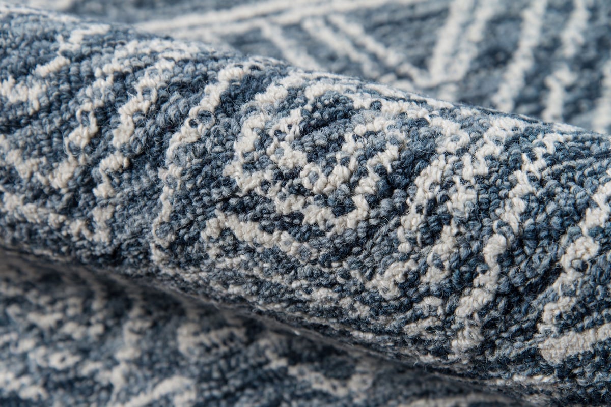 • At once relaxing and upbeat, this contemporary beauty boasts a tribal-meets-geometric design in soothing denim, so it brings a timeless, calming presence to your living room, bedroom, or entryway.