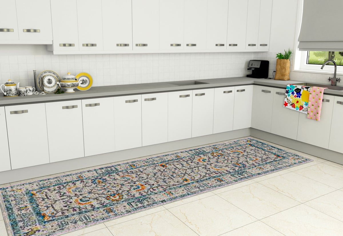 • Dyanne features traditional rug patterns inspired by stylized botanical elements like vines, palmettes, and tree of life motifs, all rendered in a dazzling palette of vivid modern hues.