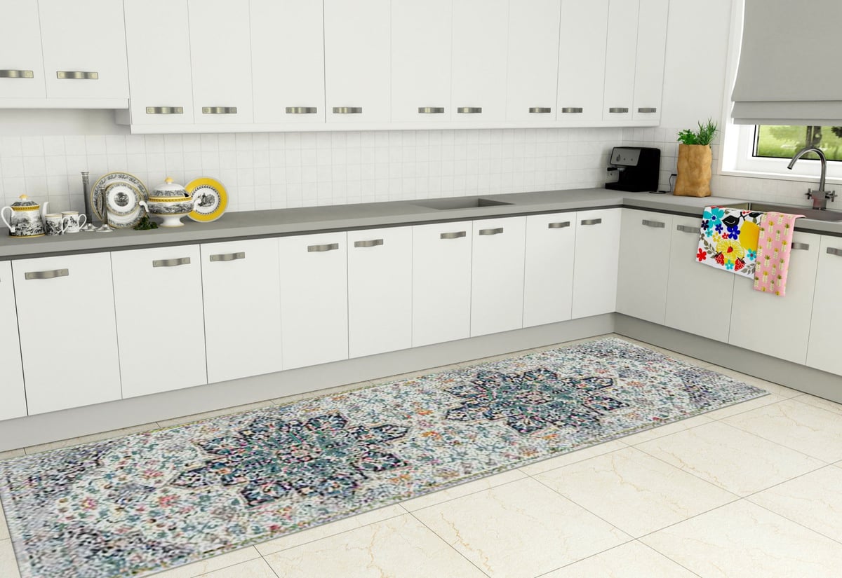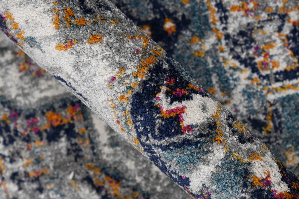 • Kriselda features a bold Moroccan rug medallion in energetic shades of blue and gold with hints of radiant magenta scattered throughout. The silvery grey base provides a versatile canvas for creative coordination possibilities.