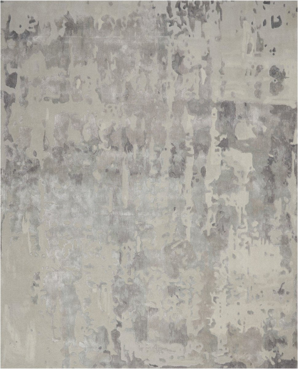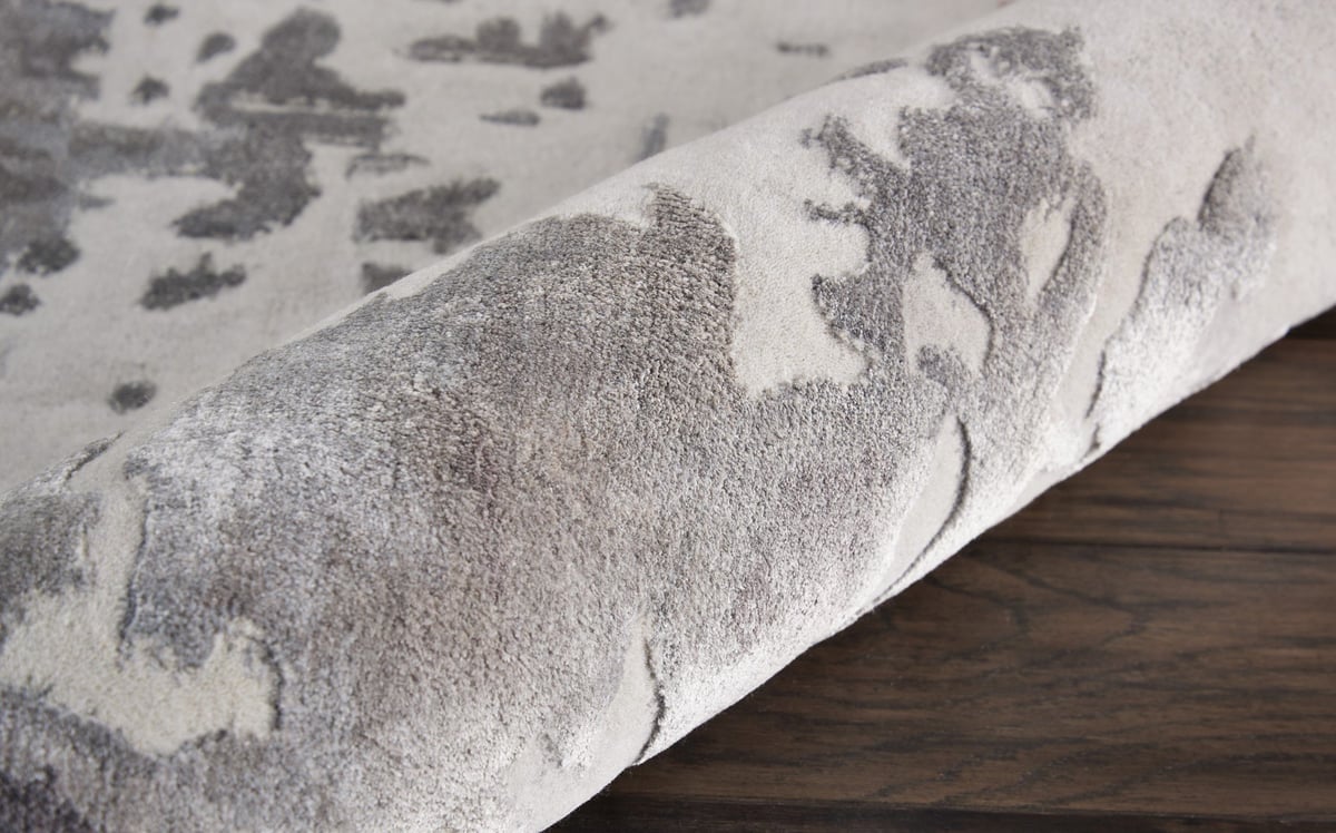 • A field of low-cut grey is dappled with a painterly abstract pattern in luminous silver, the pile height difference creating a drama of light and shadow across the surface. This contemporary area rug is especially versatile but far from ordinary.