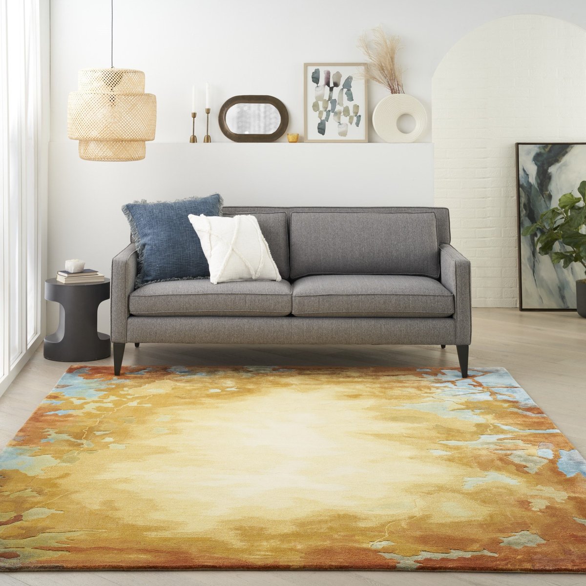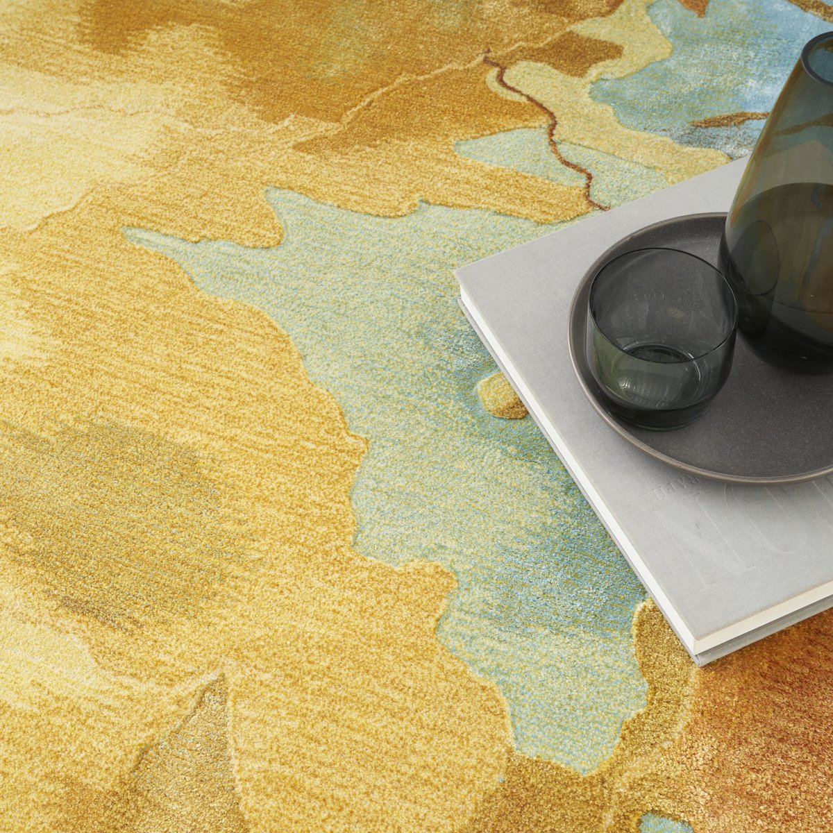 • This bold, modern area rug uses striking gold, orange, golden yellow, and blue hues to set an artistic, abstract, dawn-inspired scene and bring exciting color and dimension to your favorite room.