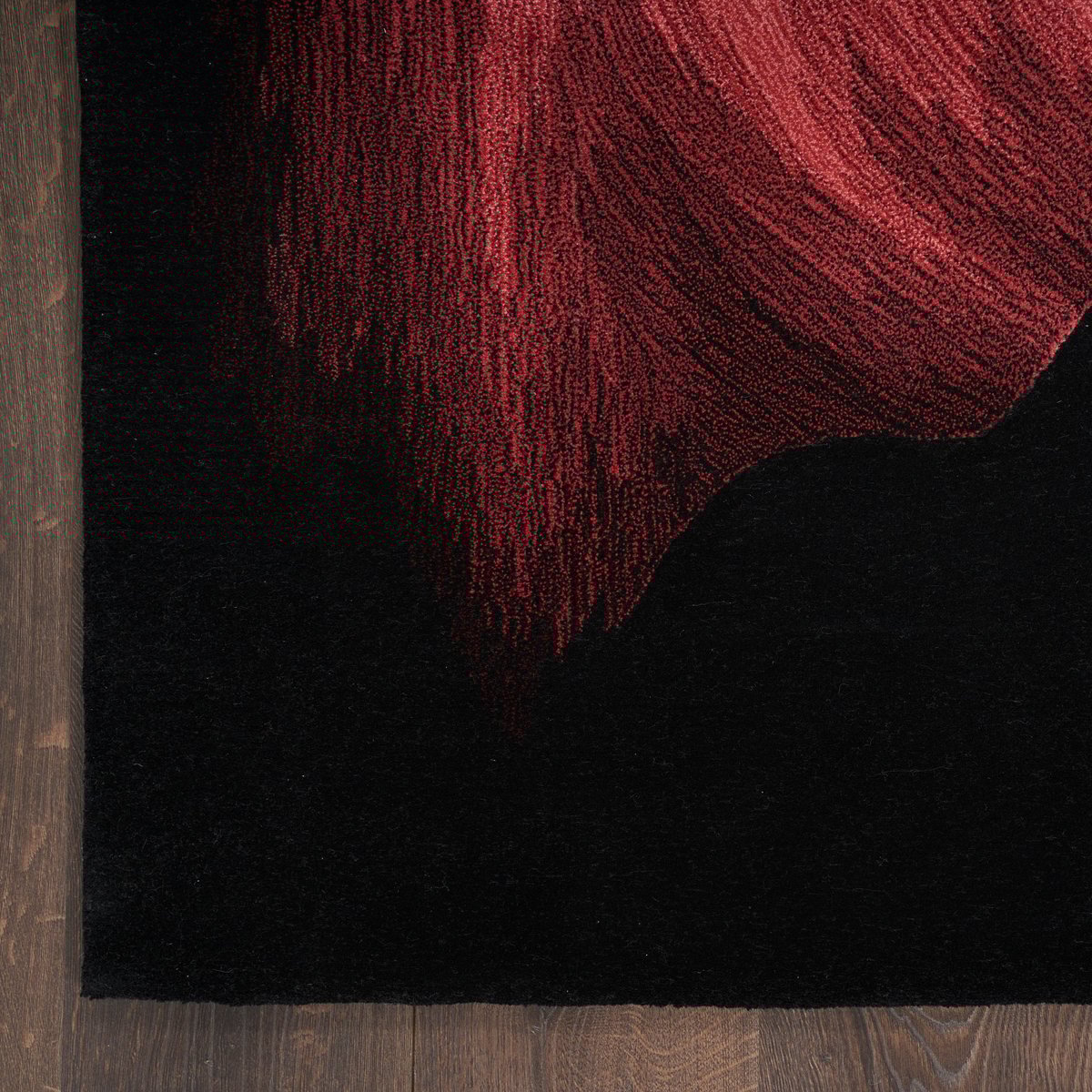 • In shades of red, purple, blue, and black, this vivid, dramatic, modern area rug is sure to make a statement. The abstract pattern adds movement and dimension to any space.