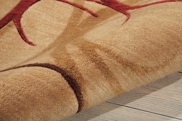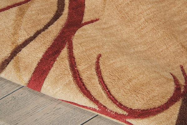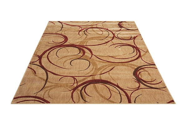 • With a warm color palette featuring a beige background and red, brown, and gold swirls, this rug would work well in a space with earthy decor.