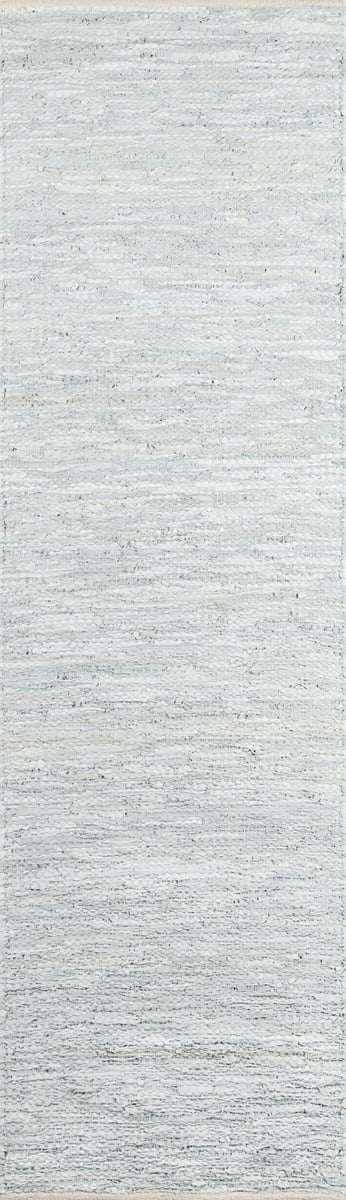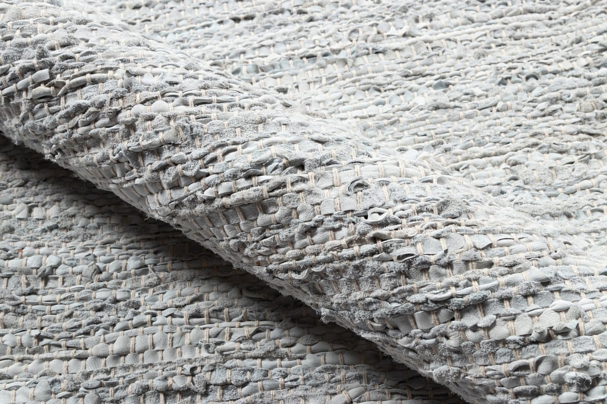 • Strips of cool grey leather are traverse the surface of this contemporary area rug, the varying widths and textures lending exquisite richness to the surface. A soft finish makes this piece especially comfortable underfoot.