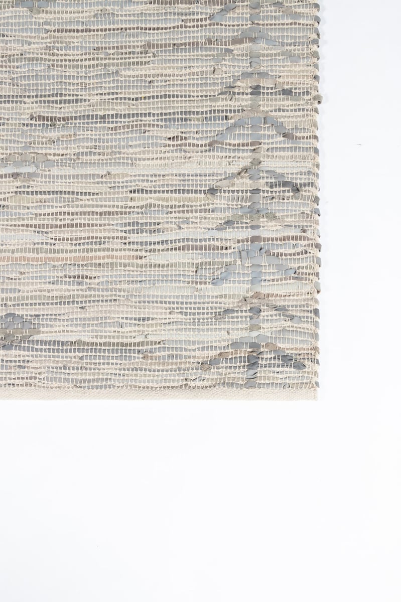 • Cool grey leather strips give the surface of this contemporary area rug a variegated palette that opens the door for a world of coordination possibilities. Larger loops create the geometric patterns that play across the top.