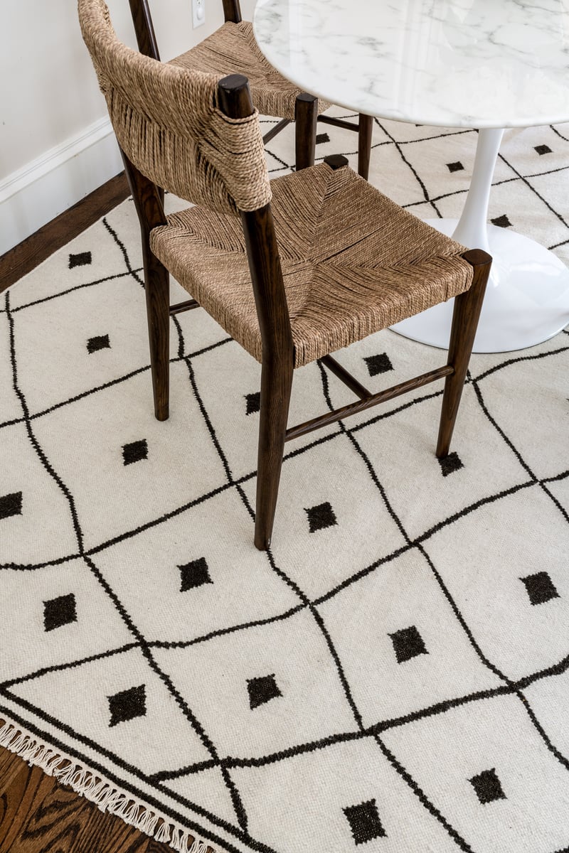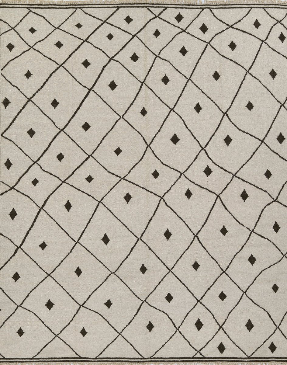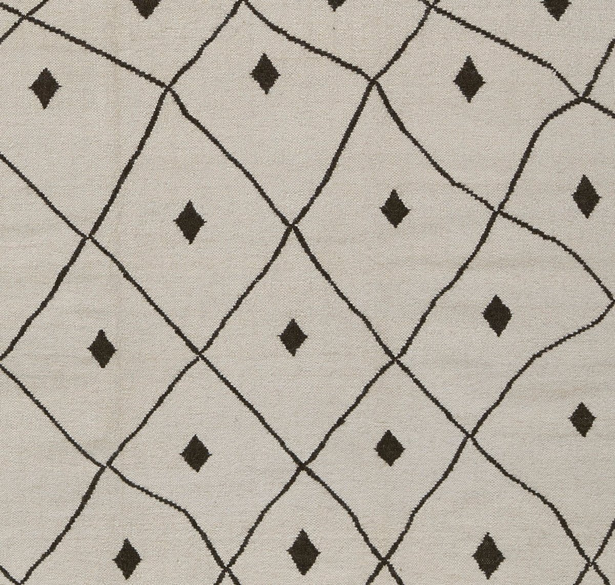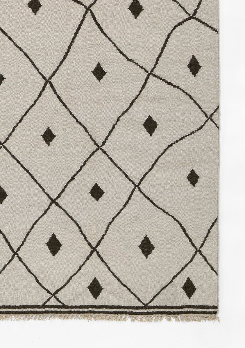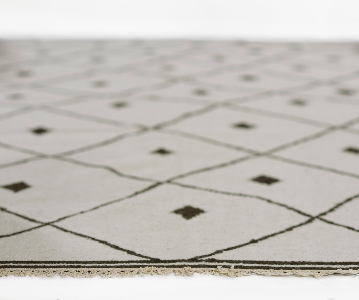 • While the fluid lattice flows across the surface, tiny diamonds punctuate each negative space. This geometric rug is fully reversible, displaying the same pattern on the reverse side for twice the wear – perfect for active living spaces.