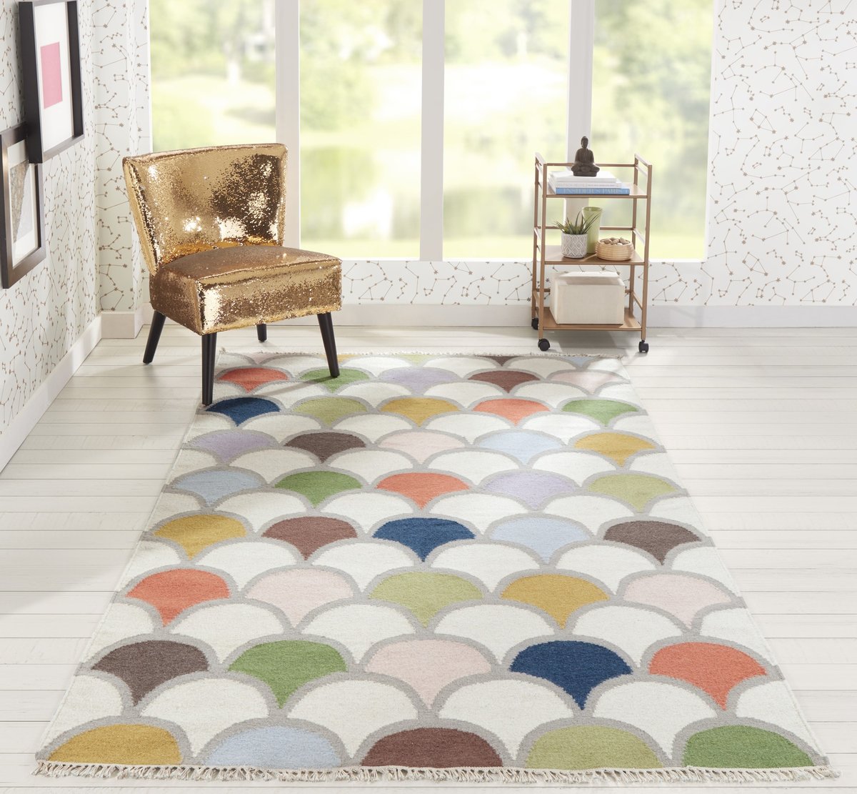 • The geometric scallop pattern on this contemporary piece delivers a layered look that's well-suited to family rooms, guest bedrooms, and entryways.