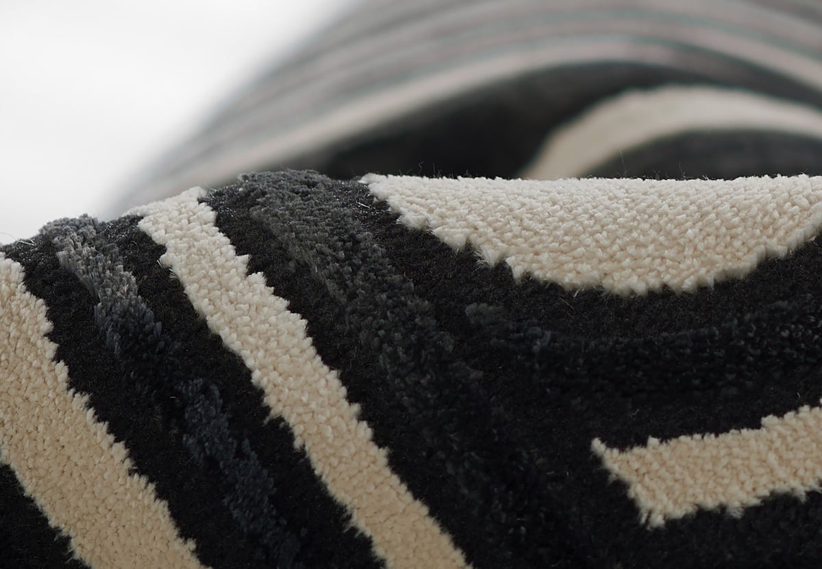 • This bold, modern area rug features an ivory and black color palette that brings contrast to your contemporary home. With its artistic pattern, this abstract rug makes a commanding addition to any well-edited space.